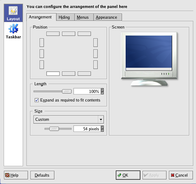 As with the other tools available with KDE, the panel is configurable. Right-click on the blank portio of the Panel and select Configure Panel. Configure the panel's orientation and size, or set the panel's hiding configuration.